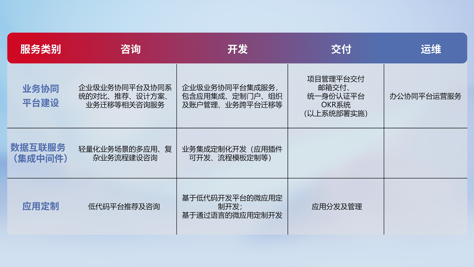 针对钉钉、、企微、、、、IDaas等平台级产品提供产品的规划、、、方案、、交付、、定制化开发等服务,,实现如统一协同办公、、智能客户服务、、混合会议管理、、、、智能数据查询、、、等业务场景,,,,实现数字化转型。。。。